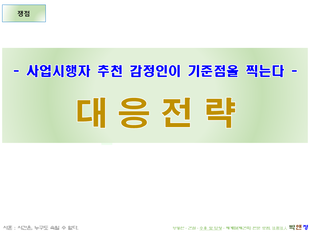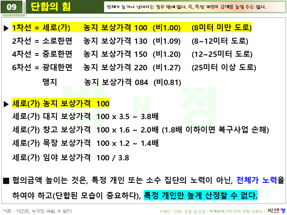 유의할 점은, 표준지공시지가를 높이면 그 비율만큼 그대로 "그 밖의 요인 보정치"가 내려가기 때문에 표준지공시지가를 높이는 것은 보상액을 높이는데, 전혀 도움이 되지 않을 뿐만 아니라 본건의 경우처럼 오히려 보상액을 내리는 부작용을 가져올 수 있다는 점을 명심해야 합니다. (아래 "04" PPT 자료의 산식 참조)