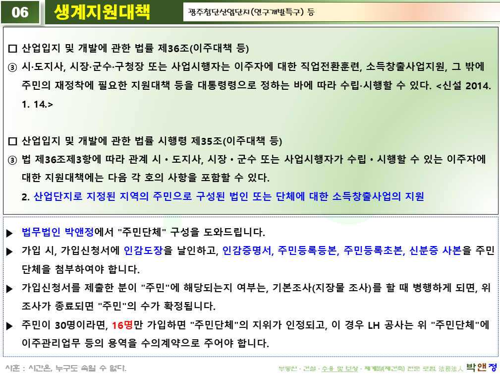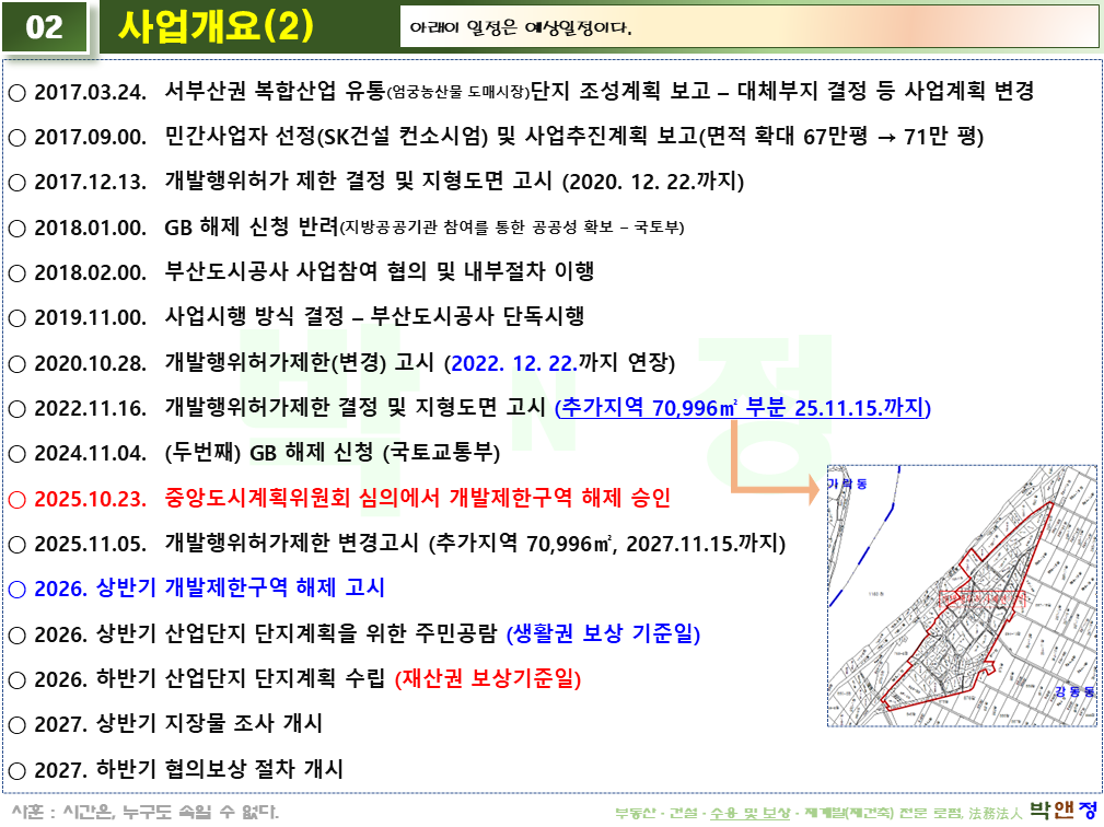 [1] 위 사업 관련 2025. 12. 04. 대책위원회 임시총회(이슈 : 위원장, 임원분들을 비롯한 지주 분들의 땀으로 2025. 10. 23. 중앙도시계획위원회 심의에서 개발제한구역 해제 승인을 받았습니다)에서 한 법무법인 박앤정의 설명자료입니다.